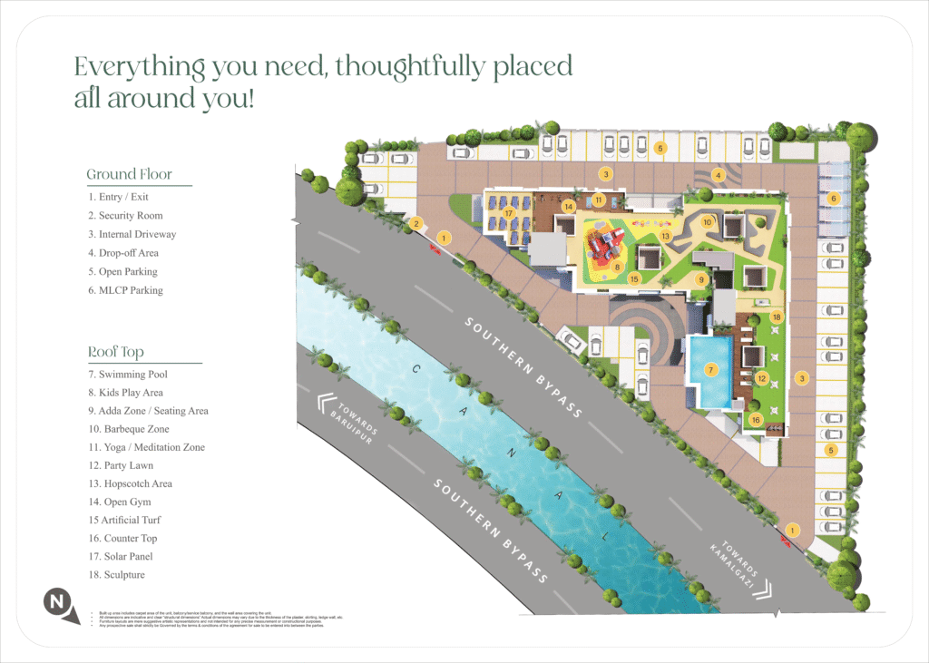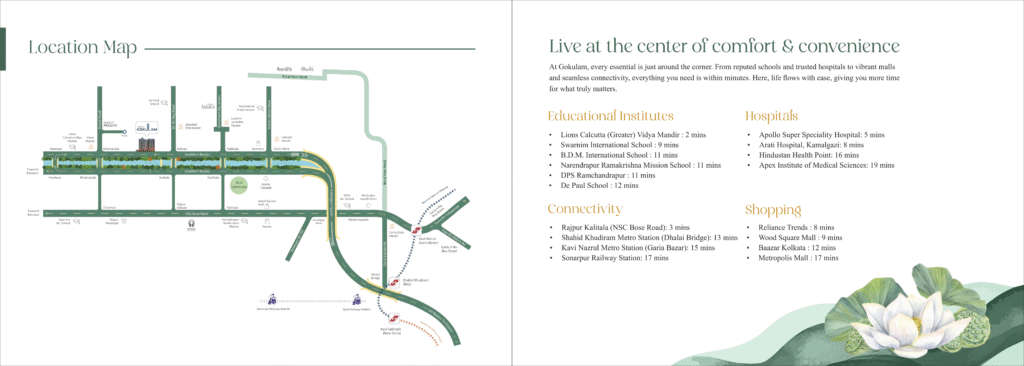 The project is located at Dhamaitala along the Southern Bypass. The full address is 279, Kalimohan Roychoudhury Road, Eastern Metropolitan Bypass, Dakshin Jagaddal, Narendrapur, Kolkata, Rajpur Sonarpur, West Bengal 700151.